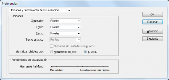 - También en Preferencias > Unidades y rendimiento de visualización, en “Identificar objetos por” selecciono la opción ID XML. Esta opción sirve para ajustar el panel de capas para que los nombres asignados a los diferentes elementos se ajusten a las convenciones de nombres XML. Los nombre deberán empezar por una letra, subrayado o dos puntos y no pueden contener espacios. Tampoco se podrán usar dos nombres iguales ya que los nombres se usarán como ID. Así, al nombrar los diferentes elementos, el SVG los identificará mediante ID por el nombre que le hemos dado a través del panel capas.