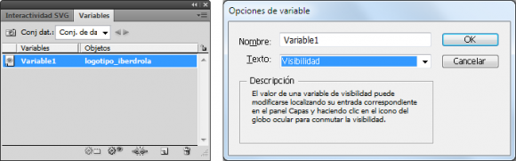 Disponemos de un panel variables que nos sirve para modificar algunos aspectos de los objetos. No he mirado todos los aspectos de este panel pero me ha parecido de muy poca utilidad. Por ejemplo, si asignas como variable un objeto y le asignas como tipo visibilidad, al ocultar el objeto desde el panel capas el objeto en SVG no será visible ya que se le habrá asignado display=”none”.